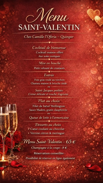 Pour la soirée du 14 février, nous vous avons imaginé un menu tout en gourmandise et en élégance, à partager à deux.